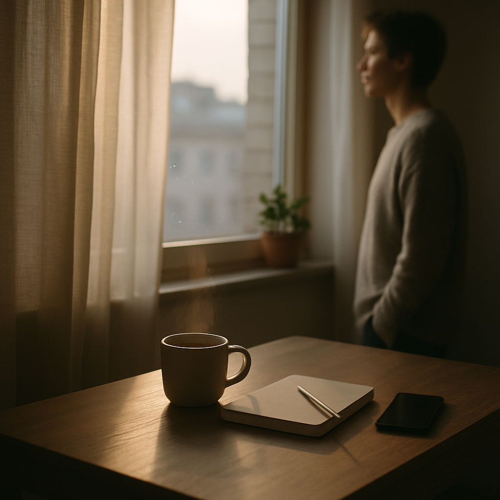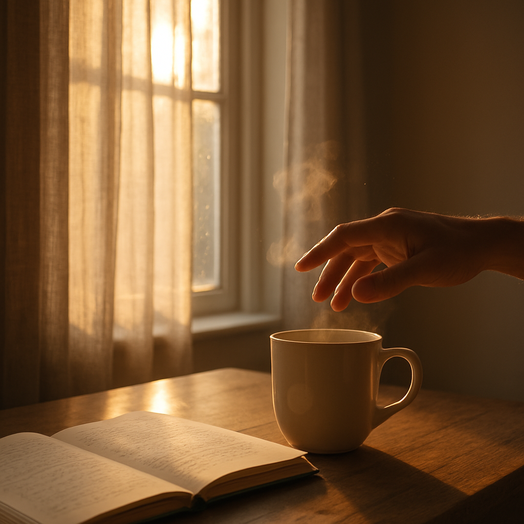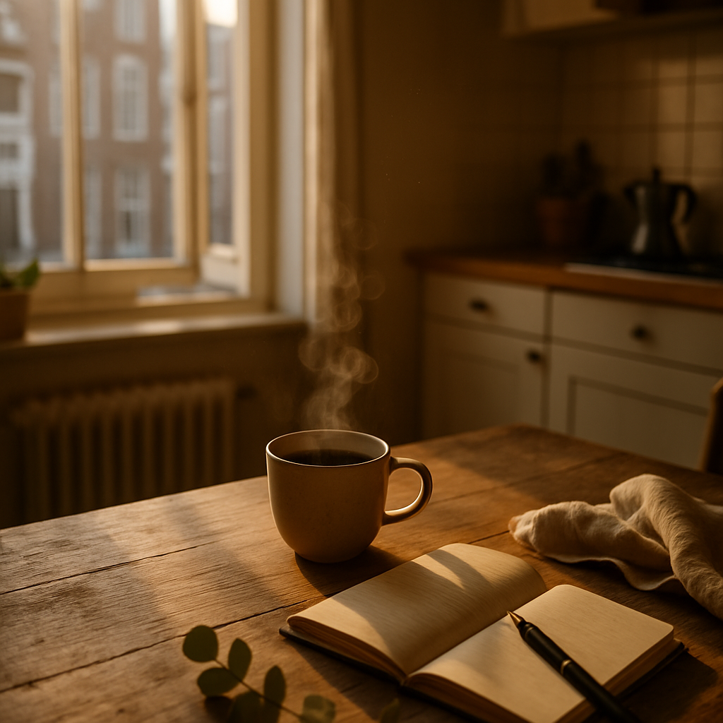 De ochtend komt niet binnen als een bevel, maar als een fluistering. Het licht schuift over de tafel alsof het…