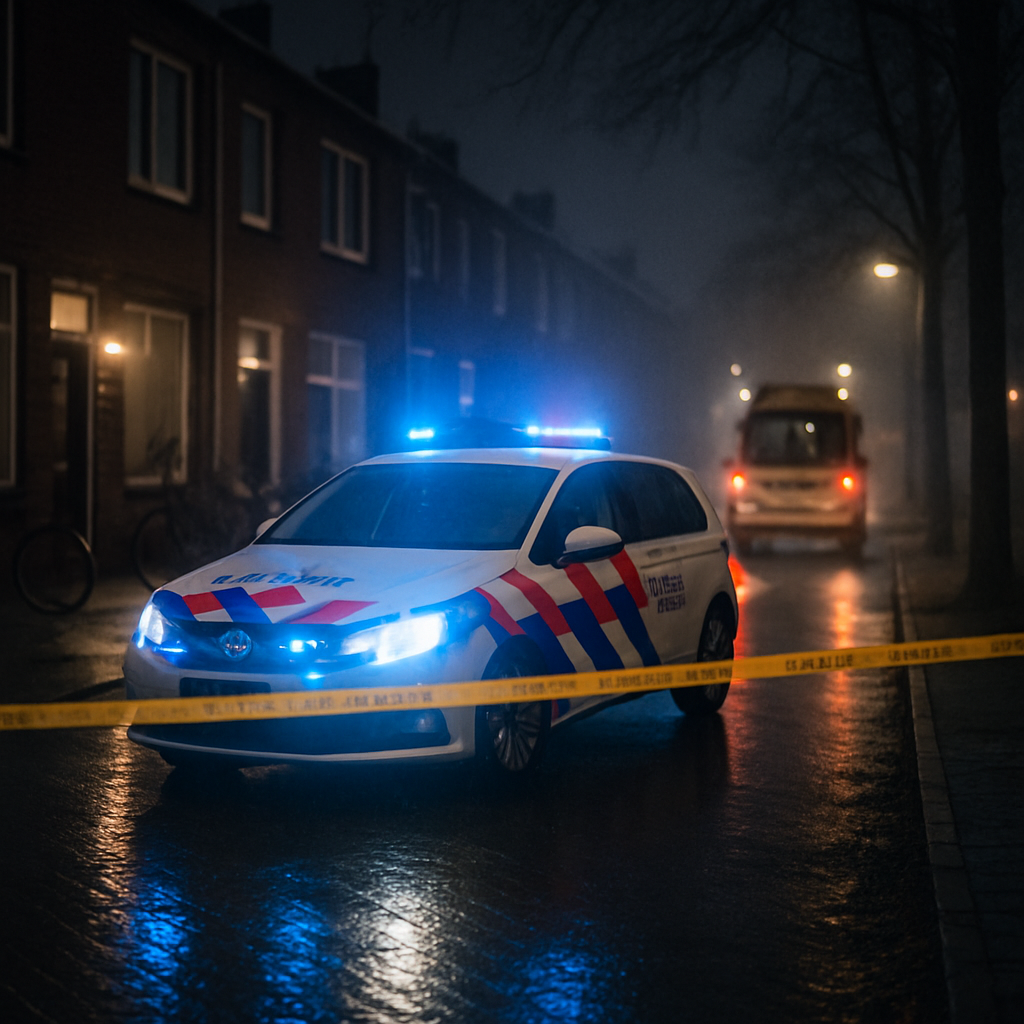 Blauw en rood wassen over bakstenen gevels, het afzetlint trekt een nieuwe contour door de avond. Agenten buigen zich over protocol, hulpverleners over lichamen: aandacht als vak, aanraking als werkwoord. In de ramen spiegelen zwaailichten als vallende sterren, maar niemand wenst dit. De straat ademt weer, schokkerig, alsof ze haar ribben telt. En ergens verderop tikt een klokje aan een keukenmuur, gewoon door, alsof het wil zeggen: ook dit zal in tijd veranderen van wond naar korst.